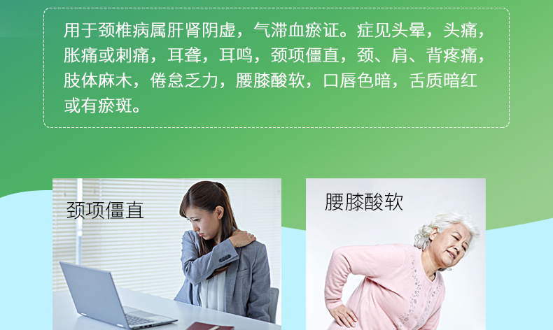 补肝益肾、活血舒筋。用于颈椎病属肝肾阴虚,气滞血瘀证,症见头昏,头痛,胀痛或刺痛,耳聋,耳鸣,颈项僵直,颈、肩、背疼痛,肢体麻木,倦怠乏力,腰膝酸软,口唇色暗,舌质暗红或有瘀斑。